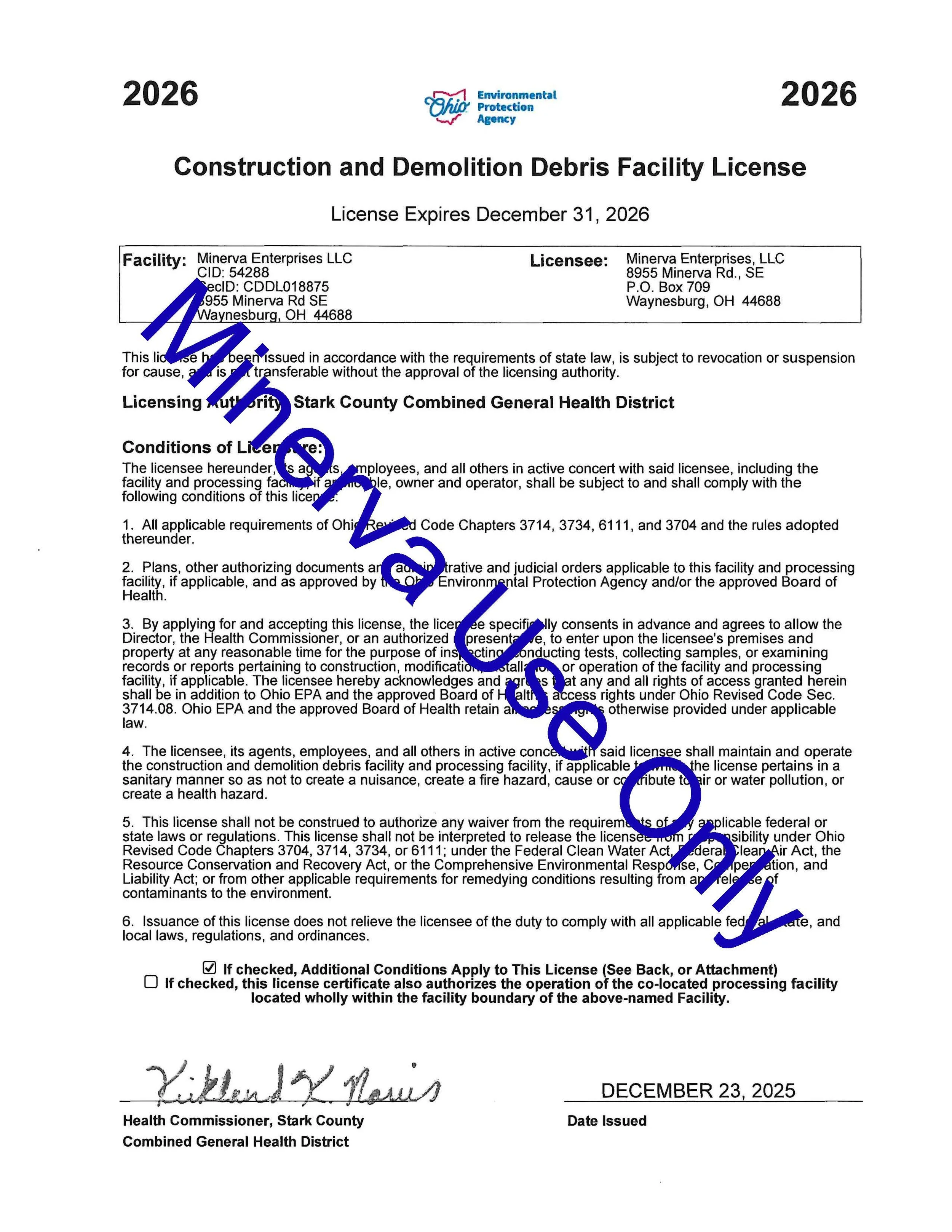Minerva Enterprises, LLC is a Construction & Demolition Debris (C&D) landfill located in Stark County Ohio. Minerva’s property was previously used as a coal strip mine in the late 1950s and 1960s, and is ideal for landfill design and development due to its quantities of non-permeable clay reserves. Minerva is not only permitted to dispose of C&D, but also Asbestos Debris and PCB Bulk Product Waste materials. Reach out to us today, so we can help you determine what methods best suit your disposal needs with our customer first approach!